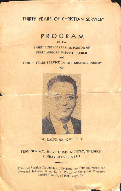 A printed program outlining the events during the week-long celebration of Dr. Ralph Mark Gilbert's third pastoral anniversary at the First African Baptist Church.